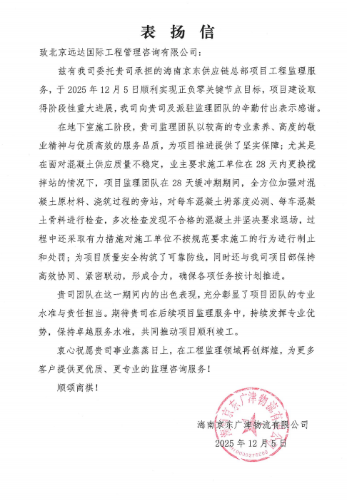 12月15日,海南京东供应链总部项目建设传来重大喜讯——项目顺利达成正负零关键节点目标,标志着工程建设迈入阶段性攻坚新阶段。项目团队收到业主发来的表扬信,对派驻管理团队的专业素养、敬业精神和高效服务给予高度认可与诚挚感谢。